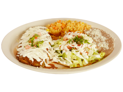 4 chicken enchiladas filled with our authentic red mole flavor, covered with lettuce, jitomate, avocado, cream and fresh cheese, onion.